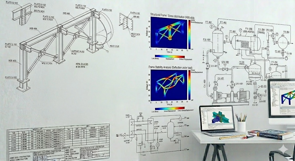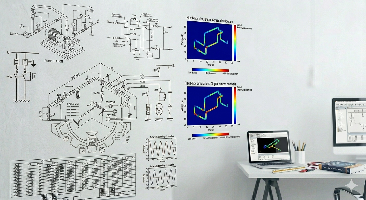 Nos compétences couvrent l'ensemble du spectre de l'ingénierie : Assistance à Maîtrise d'Ouvrage (AMO), Tuyauterie, Charpente, Électricité, CVC / HVAC, Calculs, Machines Spéciales, Mécanique, Supervision, Planning, HSE — et bien plus encore.